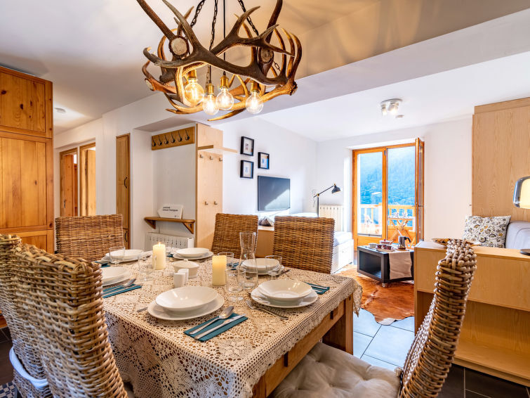 Appartement 3-kamers 60 m2, op verhoogde begane grond. Comfortabel en mooi ingericht: woon-/eetkamer met 1 2-pers divanbed (160 cm, lengte 190 cm), TV (Flatscreen TV). Uitgang naar het balkon, op het oosten. 1 kamer met 1 2-pers bed (160 cm, lengte 190 cm). 1 kamer met 2 bedden (80 cm, lengte 190 cm). Open keuken (oven, afwasmachine, 4 keramische glas kookplaten, broodrooster, waterkoker, magnetron, diepvriezer, elektrische koffiemachine, raclette oven, fondue Set (kaas)). Douche, aparte WC. Elektrische verwarming. Balkon, op het oosten gelegen. Zeer mooi panoramazicht op de bergen en het landschap. Ter beschikking: wasmachine, kinderbed tot 2 jaar, haardroger. Internet (WiFi, gratis). Parkeerplaats (2 Auto's). Niet rokers woning. Rookmelders, brandblusser.