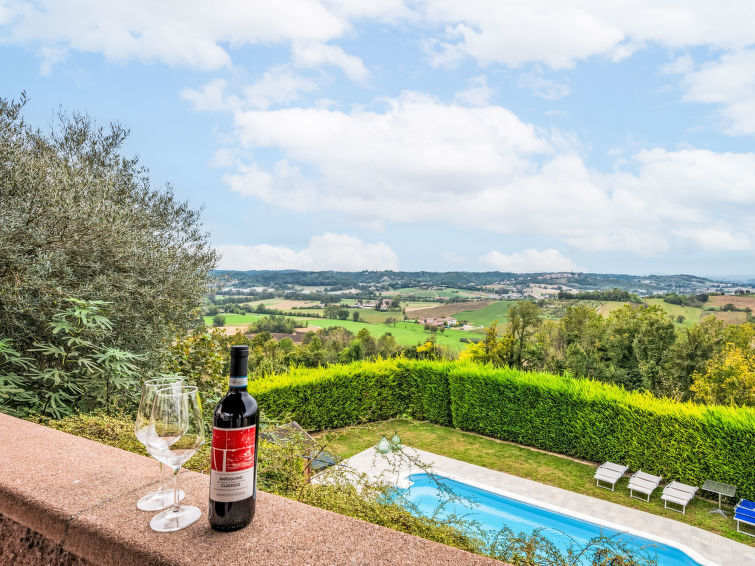 Gezellig Huis met 3 woningen van 2 verdiepingen, omgeven door velden en wijngaarden. Buiten de plaats, 2 km van het centrum van Portacomaro, rustige, zonnige ligging op een heuvel. Voor medegebruik: wild terrein 1.500 m2 (omheind) met gazon en bomen, openluchtzwembad (11 x 4 m, 150 cm diepte, seizoensgebonden beschikbaarheid: 01.Mei. - 15.Okt.). Buitendouche, terras, tuinmeubelen, parkeerplaats bij het huis op het terrein. Levensmiddelenwinkel 2 km, supermarkt 5 km, restaurant 1 km, bakkerij 2 km, bushalte 1.6 km. Attracties in de buurt: Asti 12 km, Turin 50 km, Alba 35 km. Auto noodzakelijk. Eigenaar woont in apart huisgedeelte. De eigenaar heeft een hond.